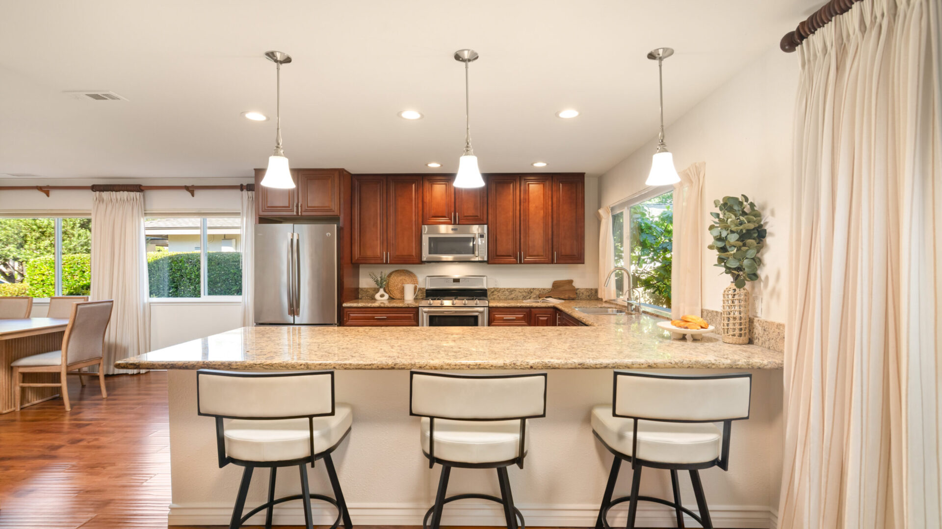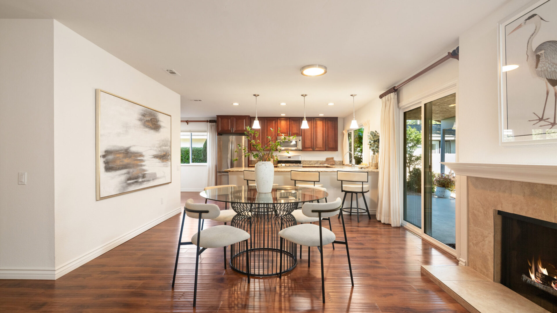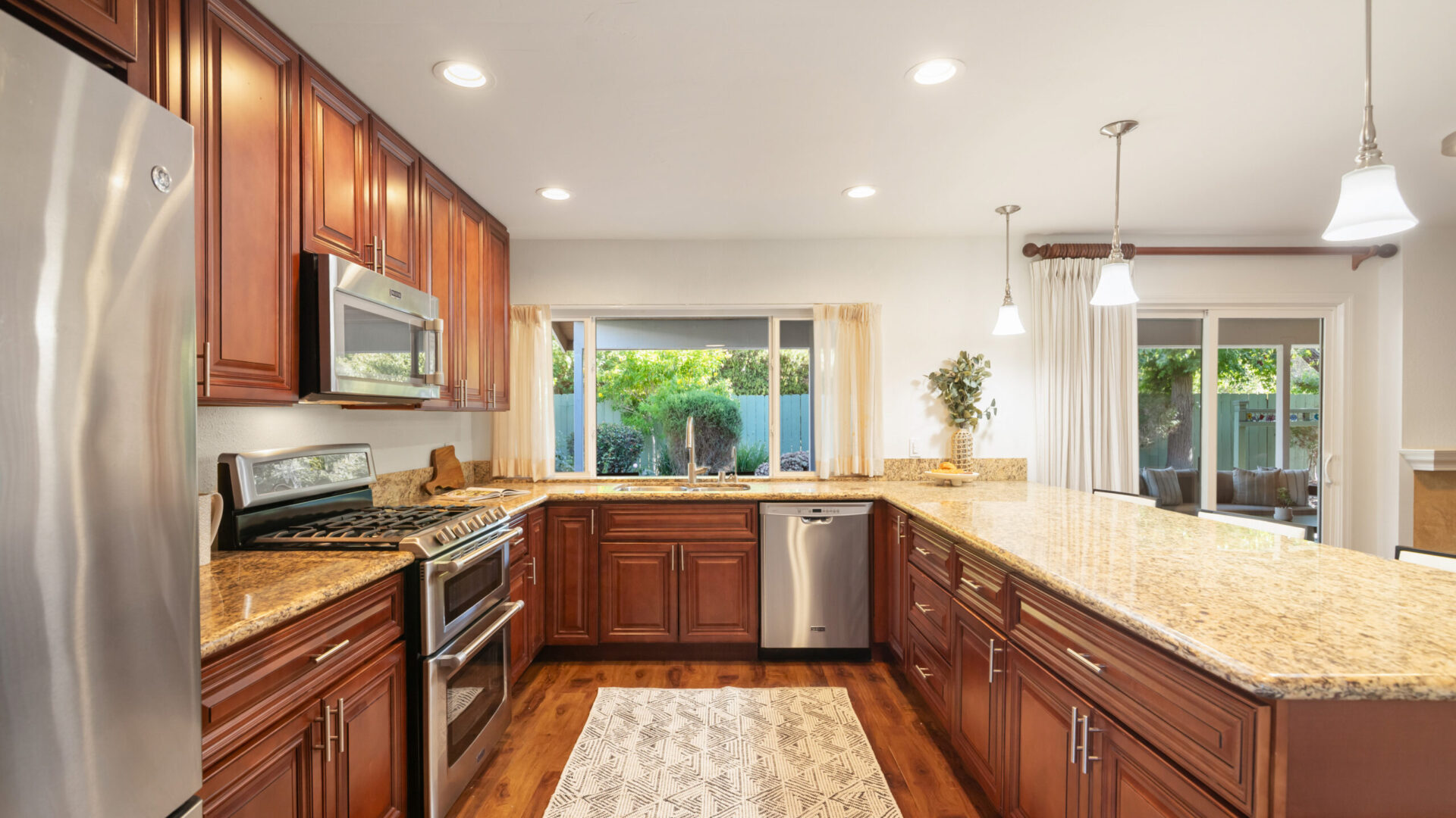 Immerse yourself in luxurious living with this completely remodeled single-story residence, located in the prestigious 55+ community of Seven Oaks in Rancho Bernardo. Perfectly positioned near shopping centers and a wealth of community amenities, this move-in-ready home is meticulously designed, offering two spacious bedrooms and two beautifully appointed bathrooms with modern finishes throughout. Recent upgrades include fresh interior paint, new LED light fixtures, ceiling fans, and an updated HVAC system. At the heart of the home is a stunning gourmet kitchen, featuring high-end Maytag stainless steel appliances, including a five-burner stove and double oven, complemented by custom wood cabinetry with soft-close drawers, modern hardware, and granite countertops. The open-concept layout boasts a large dining area and a versatile family room that can easily be converted into a third bedroom. Both bedrooms feature designer paneled doors, patterned carpeting, mirrored wardrobe doors, and a walk-in closet in the primary suite. Dual-pane vinyl windows and doors with custom window coverings enhance energy efficiency, while rich laminate flooring flows throughout the living areas. A gas fireplace is elegantly framed between two sliders, providing seamless access to a covered patio set against beautifully landscaped gardens, creating an ideal indoor-outdoor flow for relaxation and entertaining. An attached two-car garage offers ample storage, complete with a laundry area and a separate workshop space.