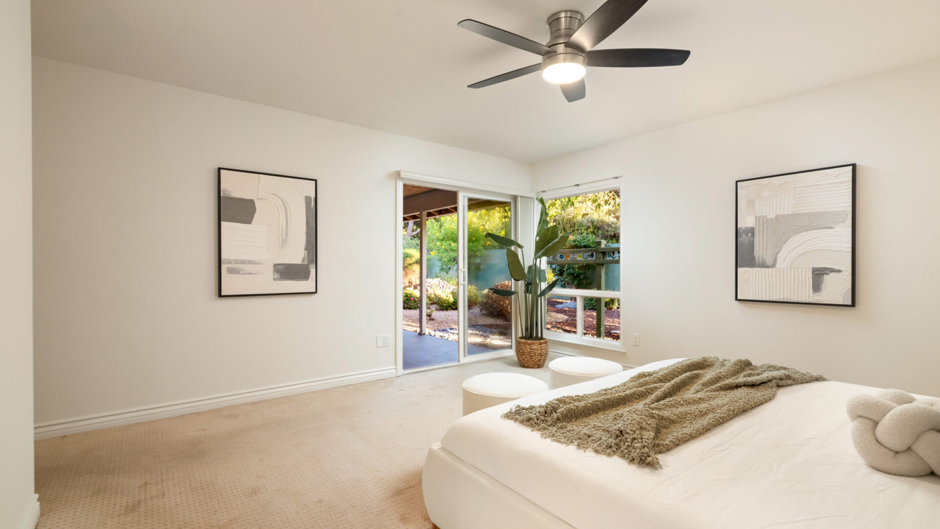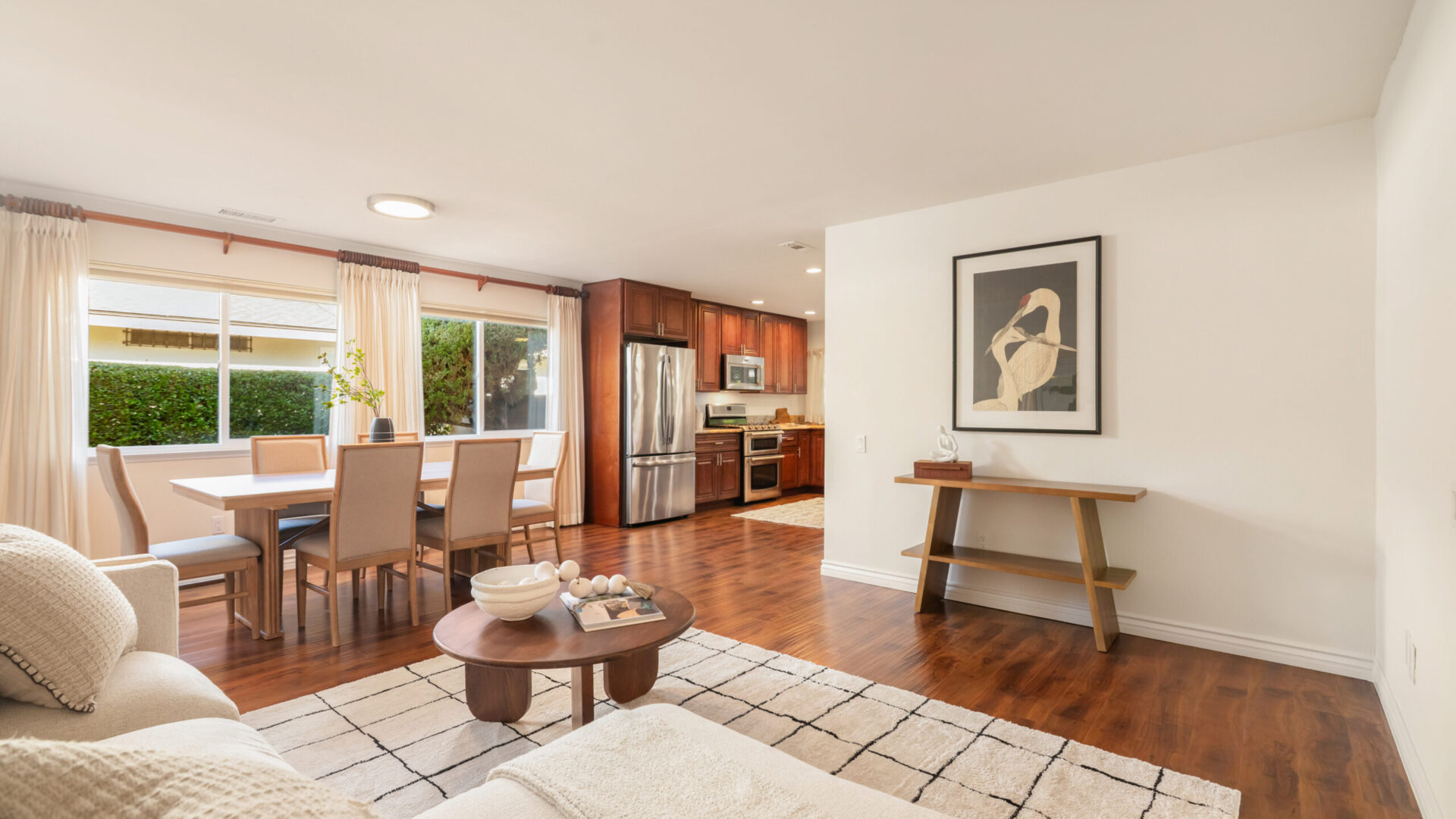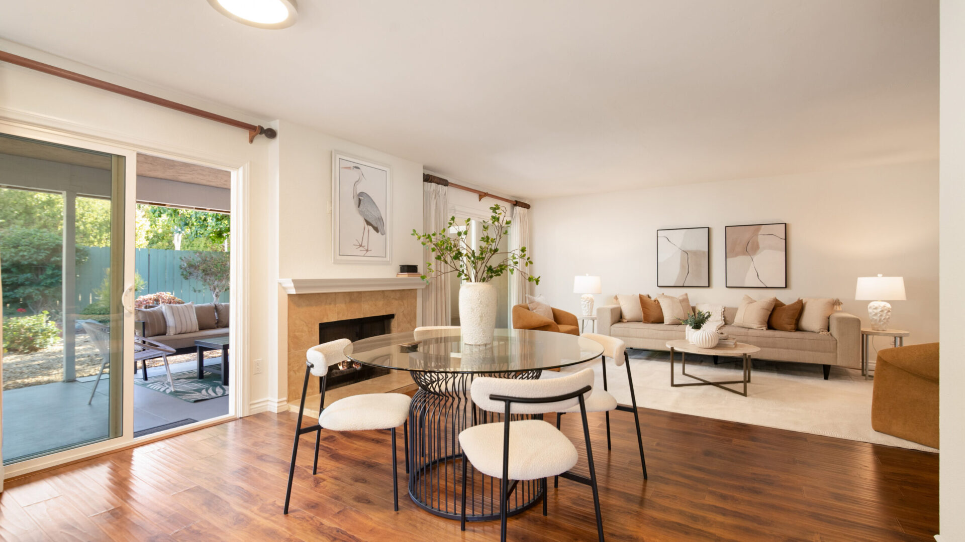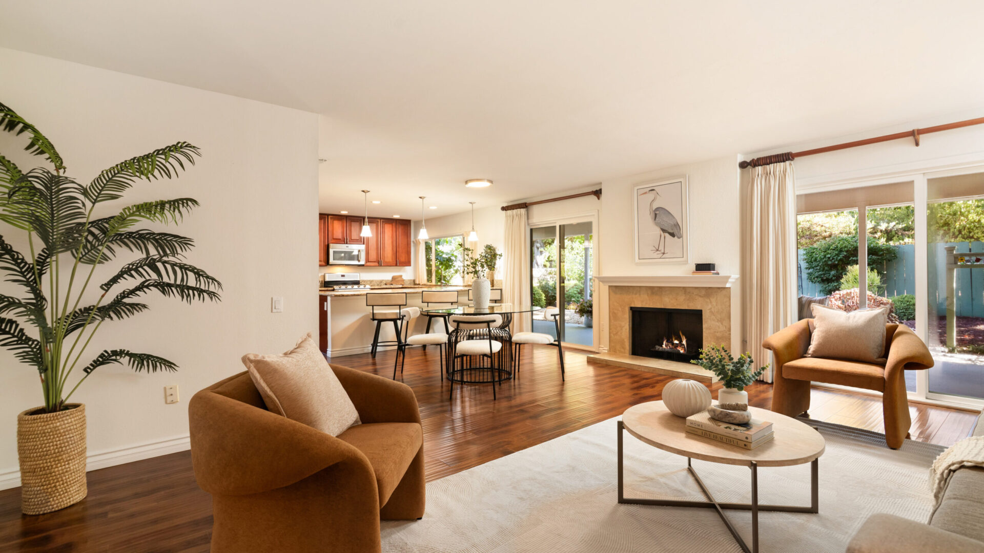Immerse yourself in luxurious living with this completely remodeled single-story residence, located in the prestigious 55+ community of Seven Oaks in Rancho Bernardo. Perfectly positioned near shopping centers and a wealth of community amenities, this move-in-ready home is meticulously designed, offering two spacious bedrooms and two beautifully appointed bathrooms with modern finishes throughout. Recent upgrades include fresh interior paint, new LED light fixtures, ceiling fans, and an updated HVAC system. At the heart of the home is a stunning gourmet kitchen, featuring high-end Maytag stainless steel appliances, including a five-burner stove and double oven, complemented by custom wood cabinetry with soft-close drawers, modern hardware, and granite countertops. The open-concept layout boasts a large dining area and a versatile family room that can easily be converted into a third bedroom. Both bedrooms feature designer paneled doors, patterned carpeting, mirrored wardrobe doors, and a walk-in closet in the primary suite. Dual-pane vinyl windows and doors with custom window coverings enhance energy efficiency, while rich laminate flooring flows throughout the living areas. A gas fireplace is elegantly framed between two sliders, providing seamless access to a covered patio set against beautifully landscaped gardens, creating an ideal indoor-outdoor flow for relaxation and entertaining. An attached two-car garage offers ample storage, complete with a laundry area and a separate workshop space.